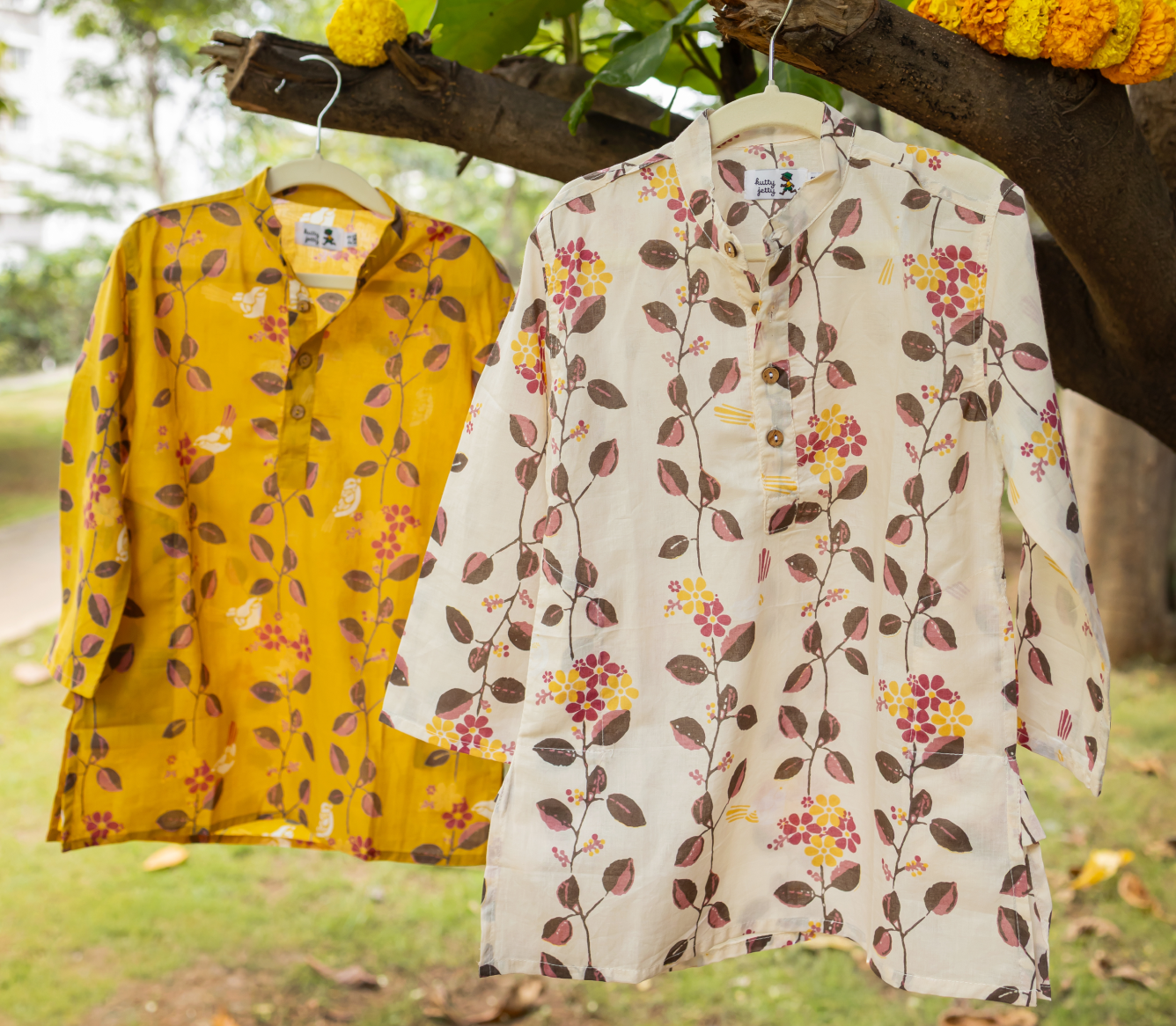 These are the founder’s mother’s (a.k.a. resident paati’s) favourite prints. These kurtas come in joyful shades of blue, yellow, and cream. The kind of colours that light up a room while staying soft and cozy for all-day wear.